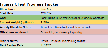 A client progress tracking spreadsheet designed for fitness professionals to monitor client goals, milestones, and progress updates in an organized system.